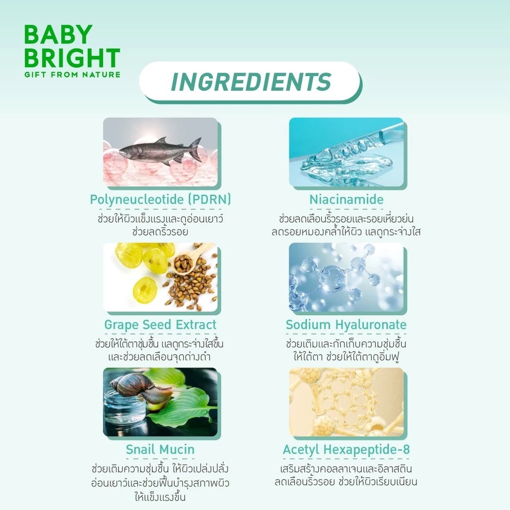 Baby Bright PDRN Salmon Rejulight Eye Mask 2.5g est un masque contour des yeux en gel conçu pour hydrater intensément, lisser les rides et revitaliser la peau sous les yeux. Formulé avec PDRN (ADN de saumon), il favorise la régénération cutanée et améliore visiblement l’élasticité de la peau.