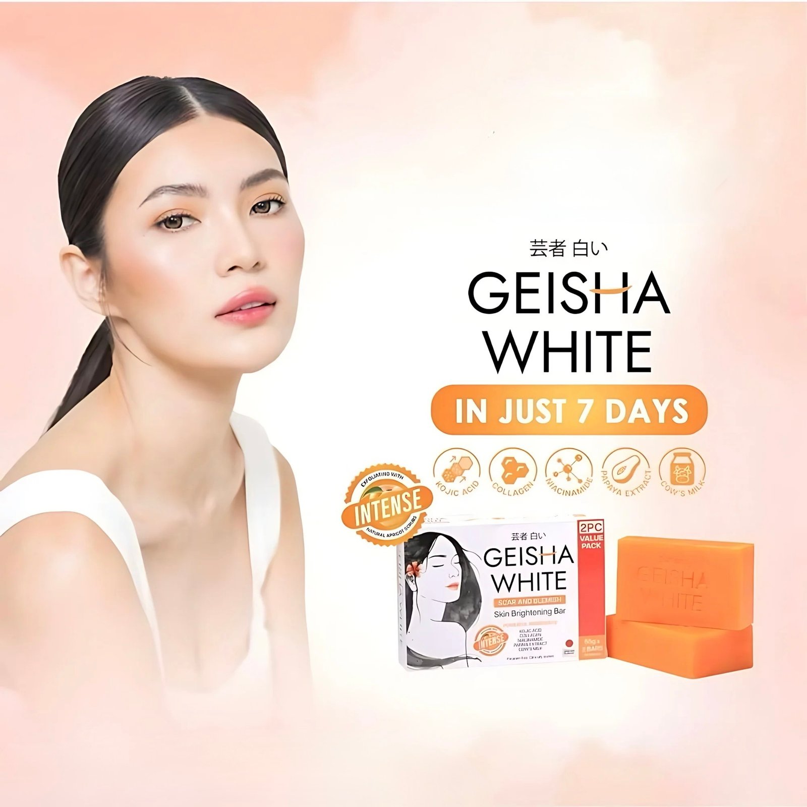 Geisha White Brightening Soap Intense 3x65g est un savon éclaircissant conçu pour un nettoyage en profondeur et une amélioration visible de l’éclat de la peau. Sa formule associe des agents exfoliants doux à base de noyaux d’abricot et du lait de vache pour favoriser le renouvellement cutané.