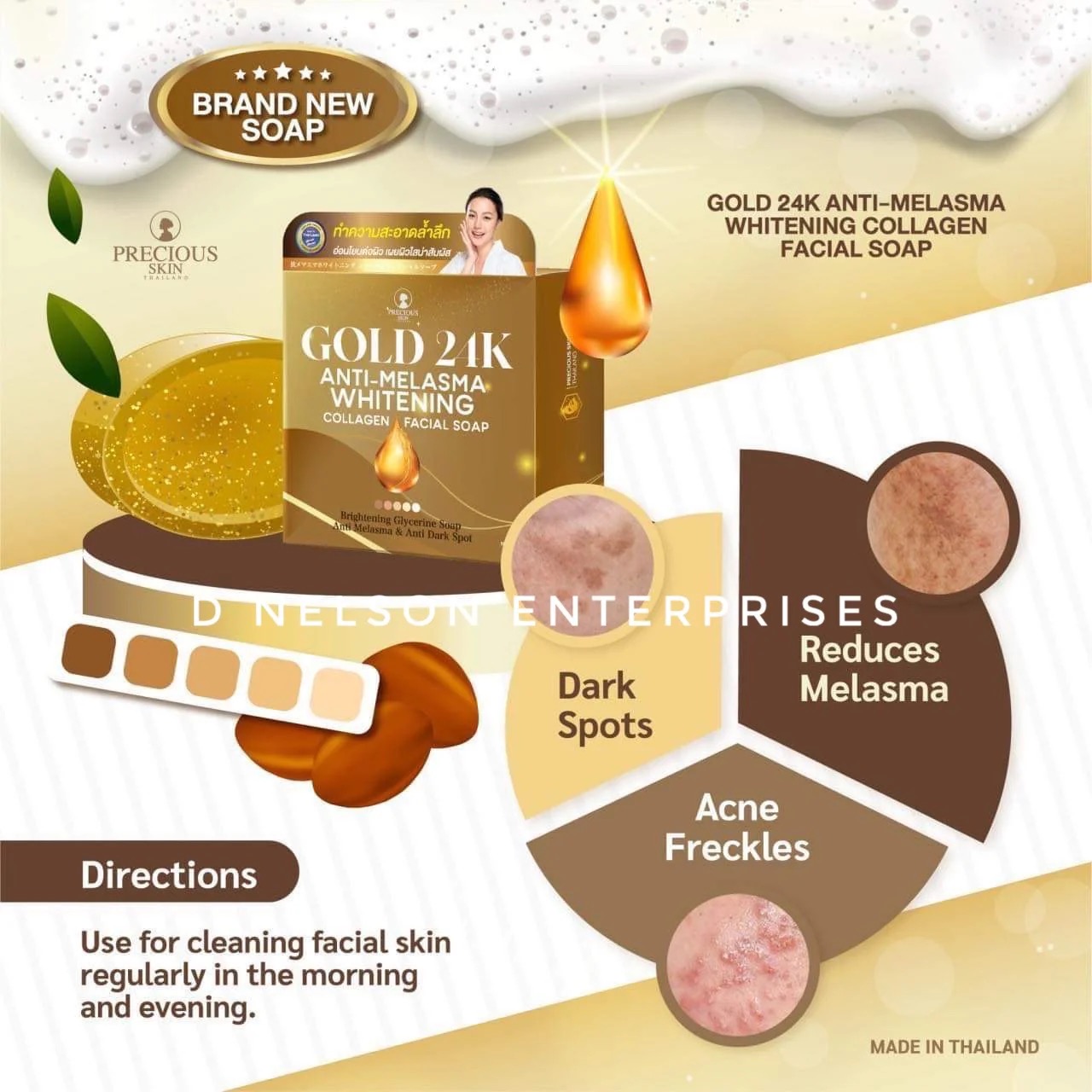Gold 24k Whitening Anti-Melasma Facial Soap Precious Skin est un savon visage éclaircissant conçu pour réduire efficacement le mélasma, les taches brunes et les irrégularités du teint. Sa formule enrichie en or 24K aide à illuminer la peau et à améliorer son apparence globale.